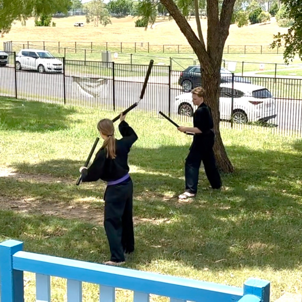 Pictured are two students from our kobudo (traditional weapons) class practicing sansetsukon (three section staff). Students on red belt and above are invited to join kobudo class which follows regular karate classes.