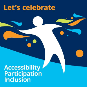 Image description : outline of a person with colored wave like shapes around them. Text reads: Let’s Celebrate. Accessibility, Participation, Inclusion.